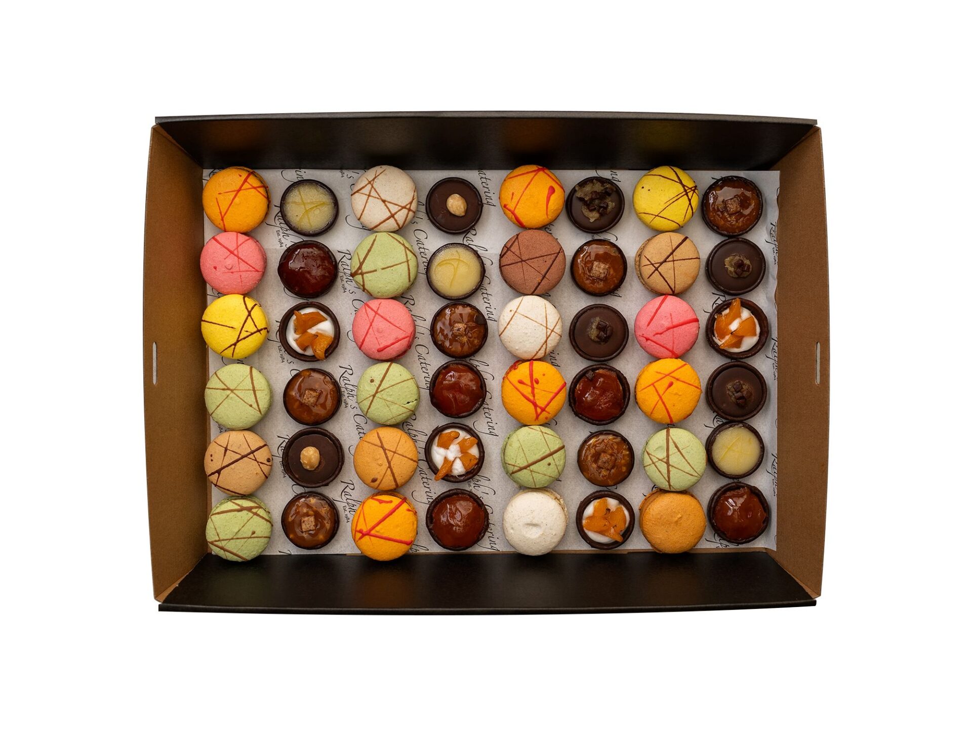 24 Mini Sweet Tarts, 24 Mini Mixed Macarons PACKAGE | Mini Sweet Tarts and Mini Mixed Macarons (48 pieces) Rec. 12-15 People | $128.00 + GST | meat vegetarian | no-requirements |