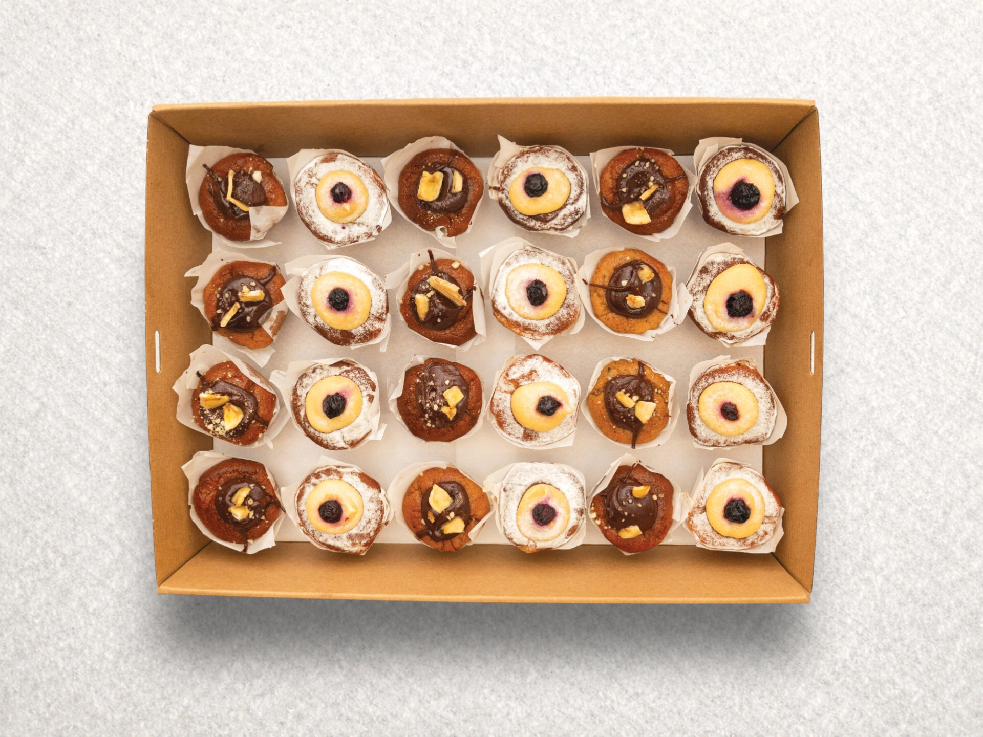 A delicious assortment of Hazelnut, banana & Nutella muffin and Blueberry & Lemon muffin.