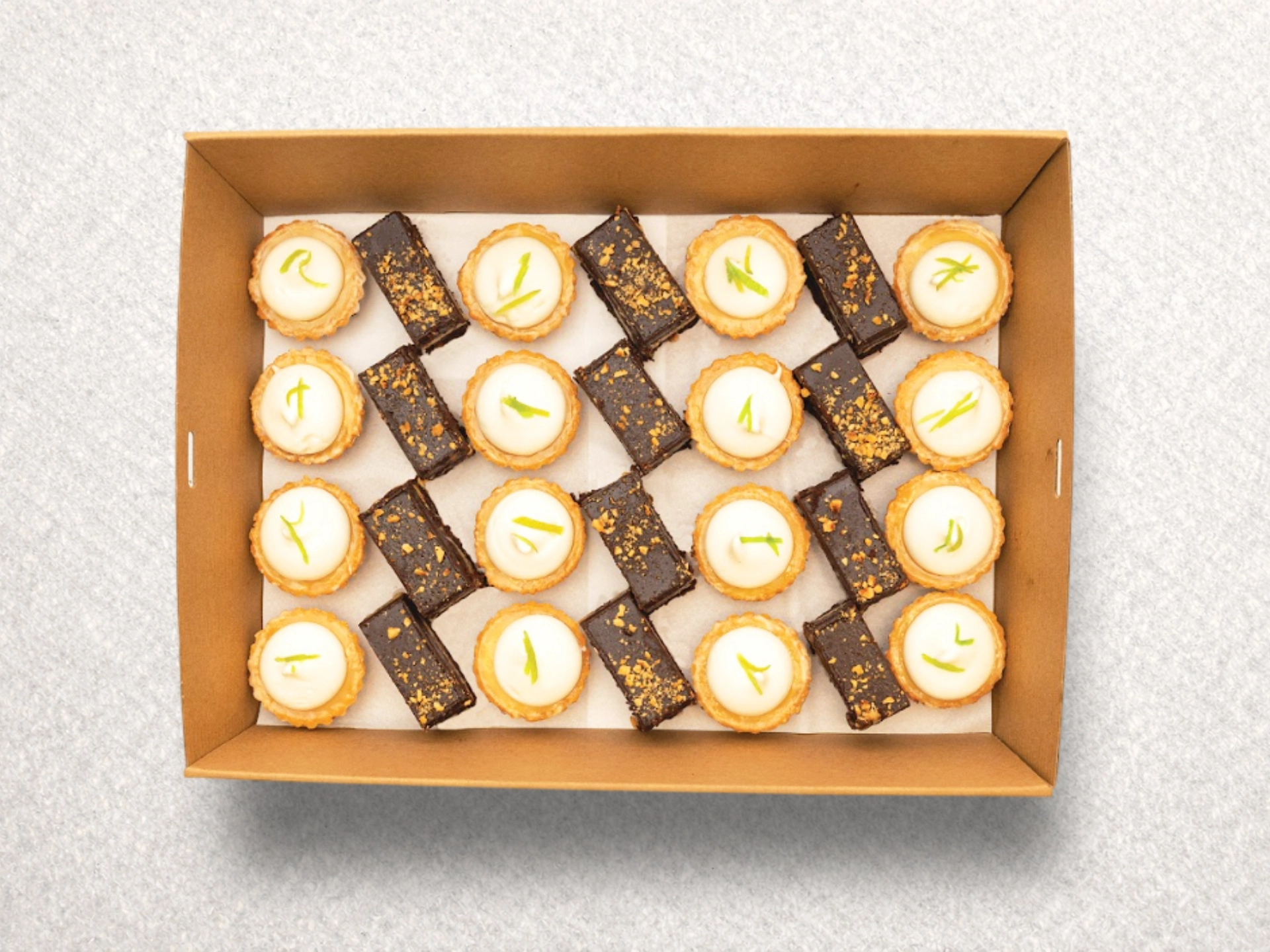 A delicious assortment of Chocolate, Salted caramel & Hazelnut Petite Slice and Citrus Meringue Tart