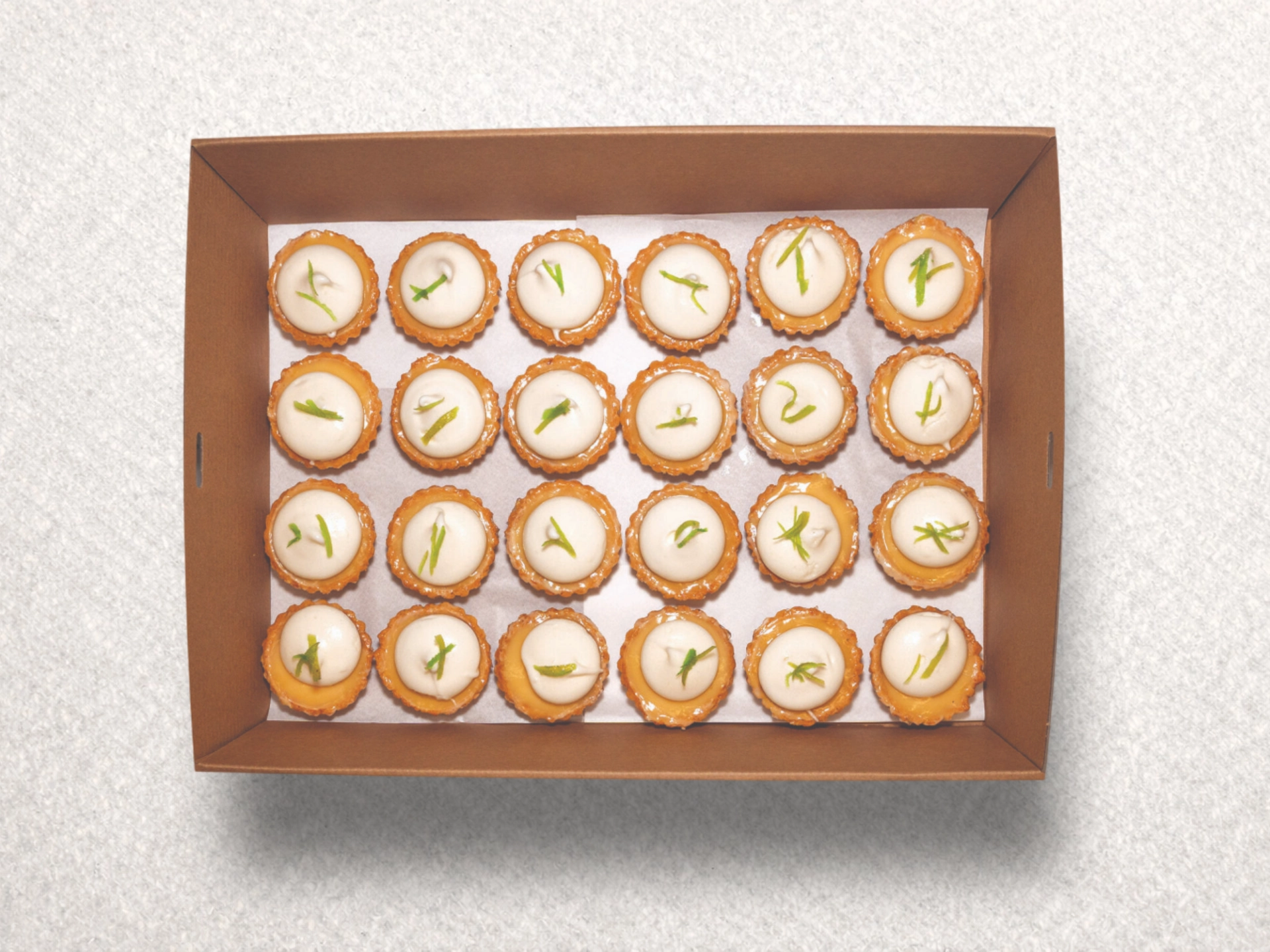 Sweet shortcrust tart base filled with smooth lemon & lime curd and topped with light meringue and candied lime zest.