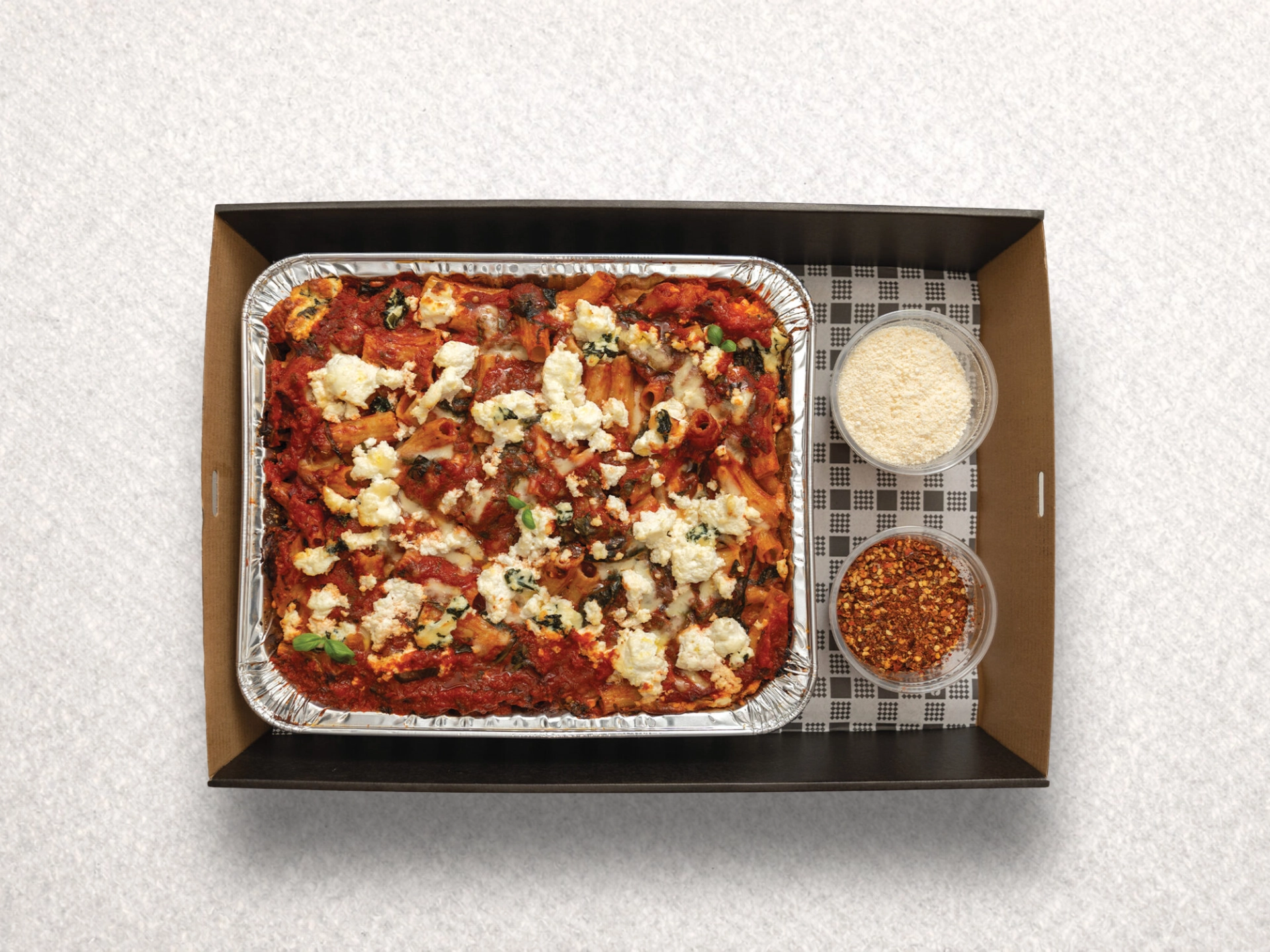 Layered Spinach & Ricotta, traditional Italian Napoletana sauce, penne pasta and mozzarella cheese come together in a delicious pasta bake, topped with a golden, cheese crust – served alongside grated parmesan and chilli flakes.
