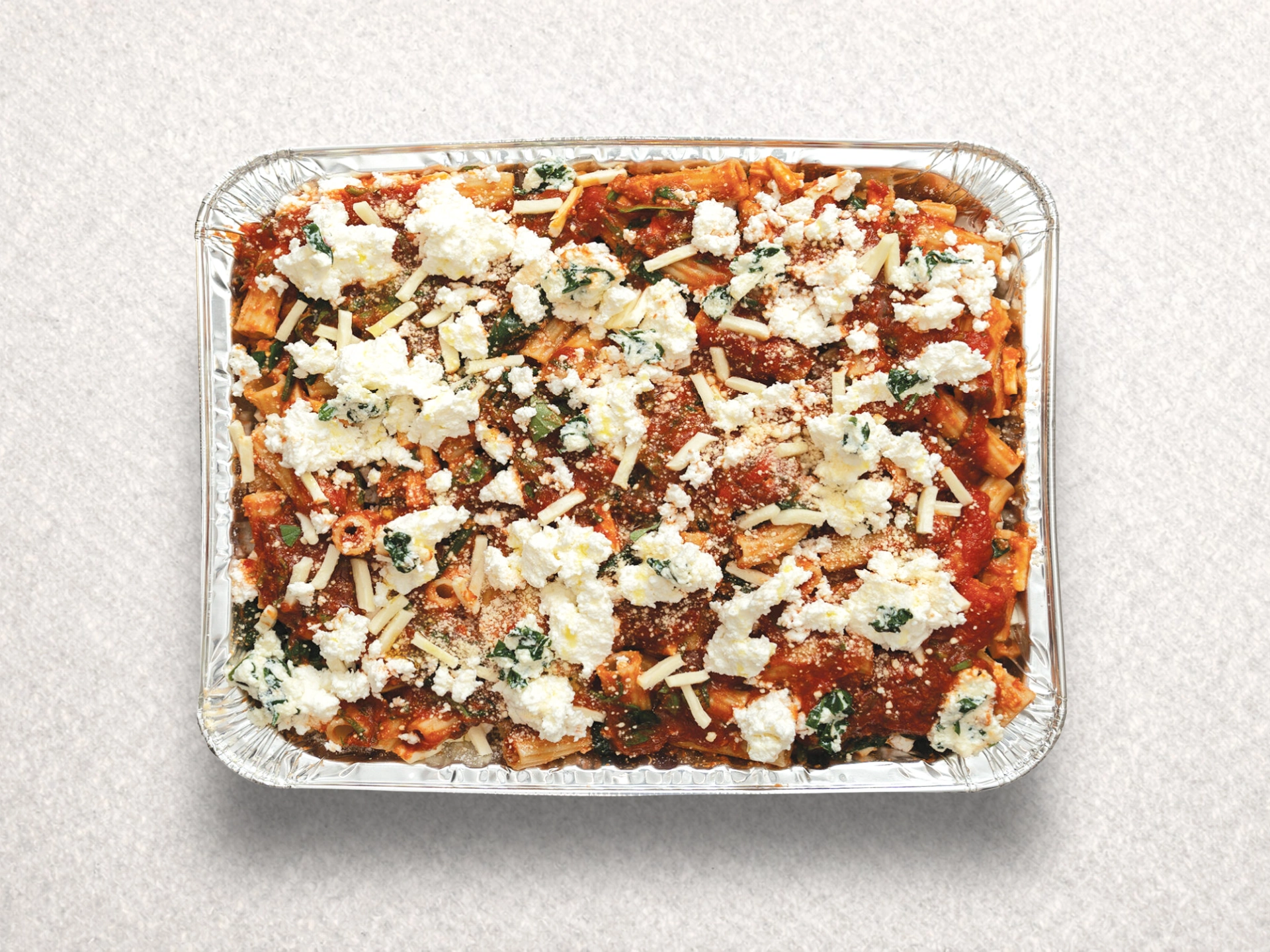 Layered with spinach and ricotta cheese, traditional Italian Napoletana sauce, penne pasta and mozzarella cheese.